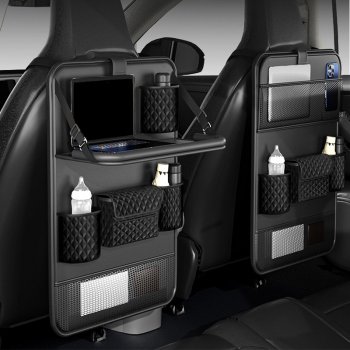 Car Seat Back Organizer with Foldable Tray & PU Leather Storage Pockets