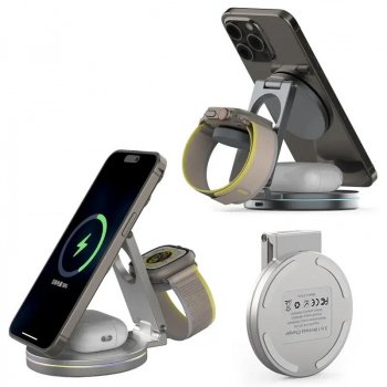 Foldable 3-in-1 Magnetic Wireless Charger with 360º Rotatable Stand